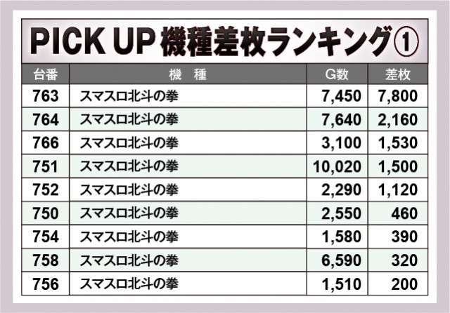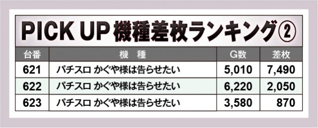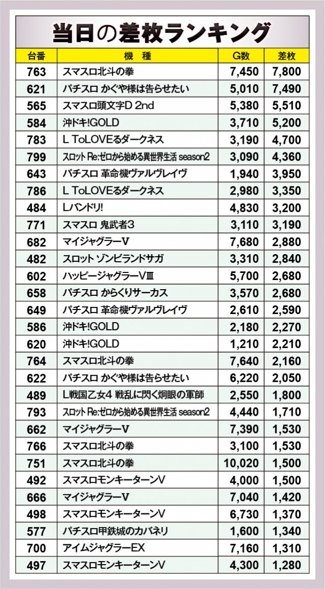 『スマスロ北斗の拳』『パチスロ かぐや様は告らせたい』から7,000枚OVERが生まれ、当日の店内の盛り上がりをリード。また前者から万回転OVERも生まれており、活気の中心にもなっていた同機種には脱帽せざるを得ない。また『沖ドキ!GOLD』『マイジャグラーⅤ』『パチスロ甲鉄城のカバネリ』といったメダル機の活躍も確認でき、館内に設置されたあらゆる機種が活躍していたと言える。