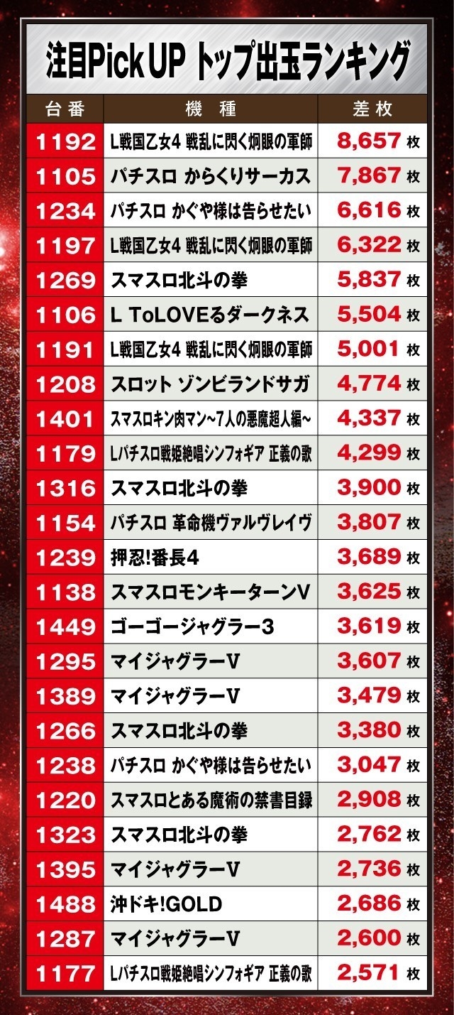 この日、最もプレイヤーの注目を集めていたのが『L戦国乙女4 戦乱に閃く炯眼の軍師』で、ランキングトップになった1192番台の+8,657枚をはじめ1197番台が+6,322枚、1191番台が5,001枚と複数の台がランキング上位を占めた。