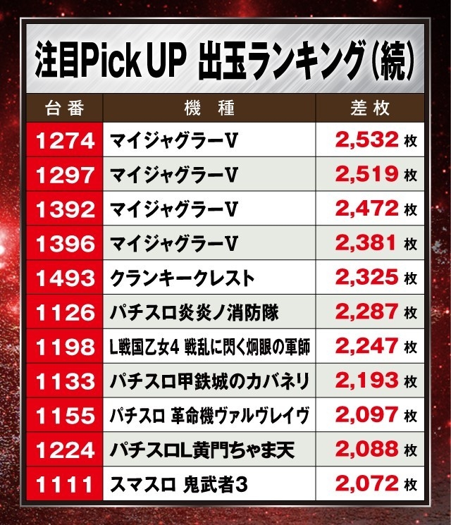 また、その他の機種では『パチスロ からくりサーカス』で+7,000枚超、『パチスロ かぐや様は告らせたい』で+6,000枚超が発生。さらにAタイプの『マイジャグラーⅤ』も奮闘しており+3,000枚超が2台、+2,000枚超が6台という好成績を残している。