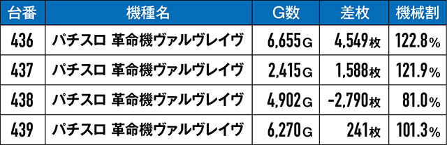 『パチスロ 革命機ヴァルヴレイヴ』コーナーにて、4台並んで好挙動を示しているゾーンを発見!1台はマイナスになっていたものの、4,500枚オーバー台が出るなど、概ね結果に繋がっていたようだ。