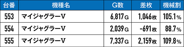 『マイジャグラーⅤ』のこちらの3台は、総ゲーム数の少ない真ん中の台のみマイナスに。6,000G以上回された両脇の2台は危なげなくプラス差枚を達成!