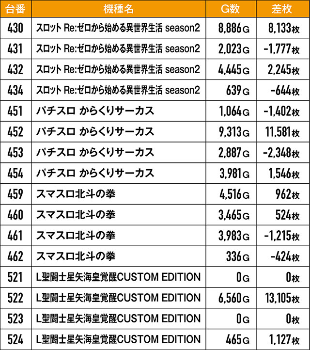 新台の『スロット Re:ゼロから始める異世界生活 season2』がさっそく8,000枚オーバーを叩き出したかと思えば、『パチスロ からくりサーカス』からは11,000枚超え記録がお目見え。かと思えば『L聖闘士星矢海皇覚醒CUSTOM EDITION』が13,000枚超えを実現するなど、見せ場の多い1日に。