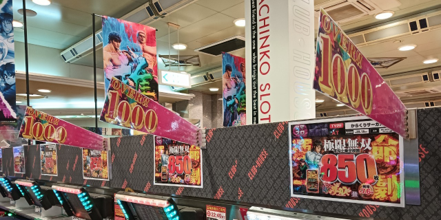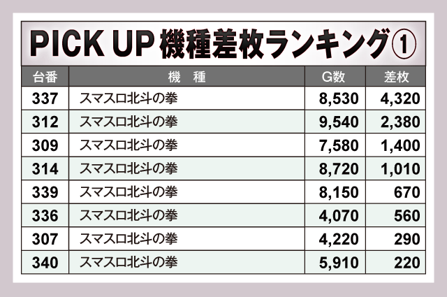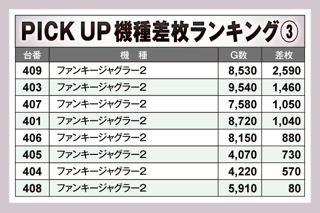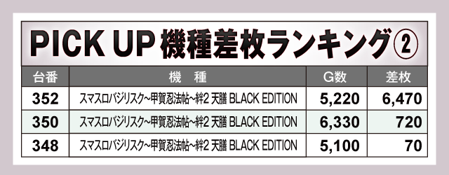 次にPICK UP機種を見てみると、『スマスロ北斗の拳』では+4,000枚超、『スマスロバジリスク~甲賀忍法帖~絆2 天膳 BLACK EDITION』では+6,000枚超が発生、さらに『ファンキージャグラー2』は全10台中8台がプラスで終了しておりシマ内の活気が途切れることはなかった。