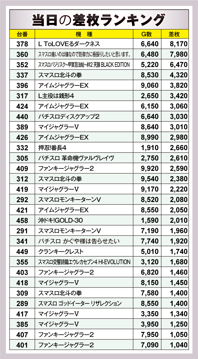 この日、プレイヤーの注目を集めたのが『L ToLOVEるダークネス』で+8,170枚を叩き出す見事な結果を残しランキングトップに。