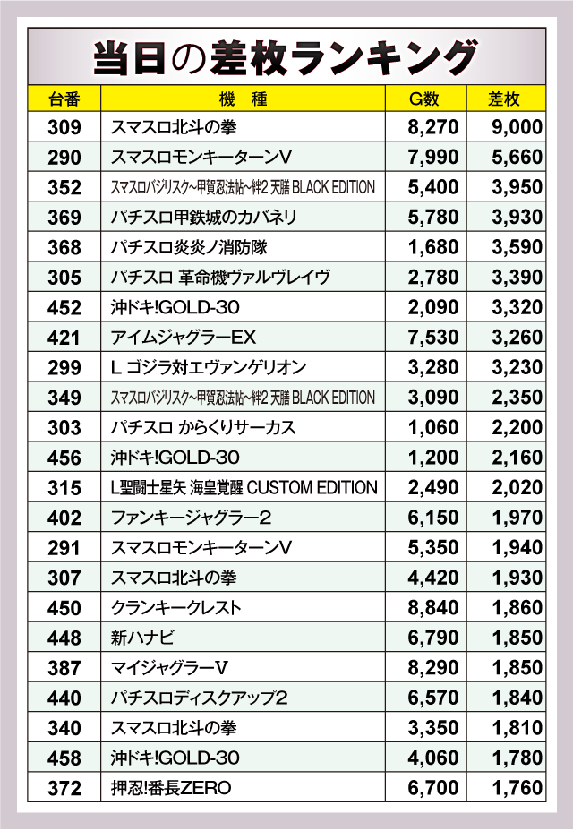 その他の機種では、Aタイプながらジャグラーシリーズも大奮闘。421番台の『アイムジャグラーEX』の+3,260枚はじめ『ファンキージャグラー2』や『マイジャグラーⅤ』も好成績を残しランキング上位に食い込んでいる。