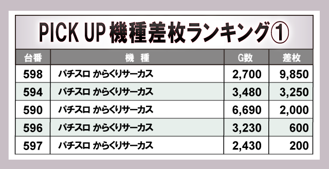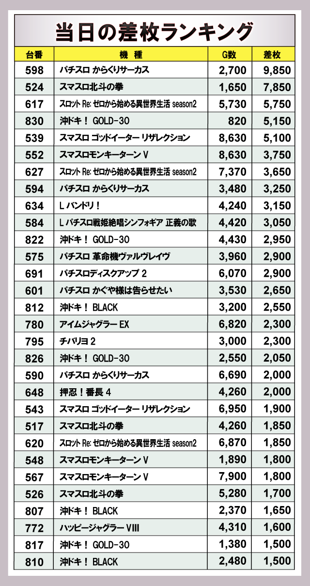 この日は残念ながら万枚OVER台は発生しなかったが、『パチスロ からくりサーカス』+9,000枚OVERを筆頭に、『スマスロ北斗の拳』で+7,000枚OVERを記録!人気スマスロ機の活躍が目立っていたが、『沖ドキ』シリーズや『ジャグラー』シリーズといったメダル機もランクインしており、幅広い機種にチャンスがあったことが窺える。