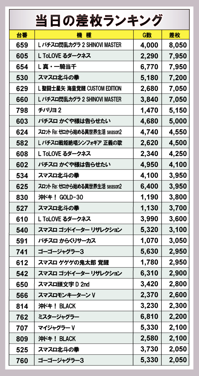 ※差枚数順に掲載しています。