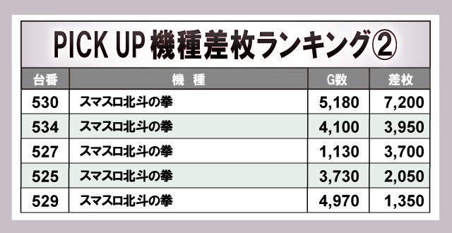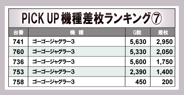 上表の7機種は4桁プラス台が多数発生し、大きな熱気を生み出している。スマスロ機からメダル機まで各所で好況スポットが形成されており、打ちごたえのある状況が整っていた様子から、館内の盛り上がりに大きく貢献していたと言えるだろう。