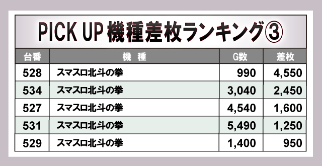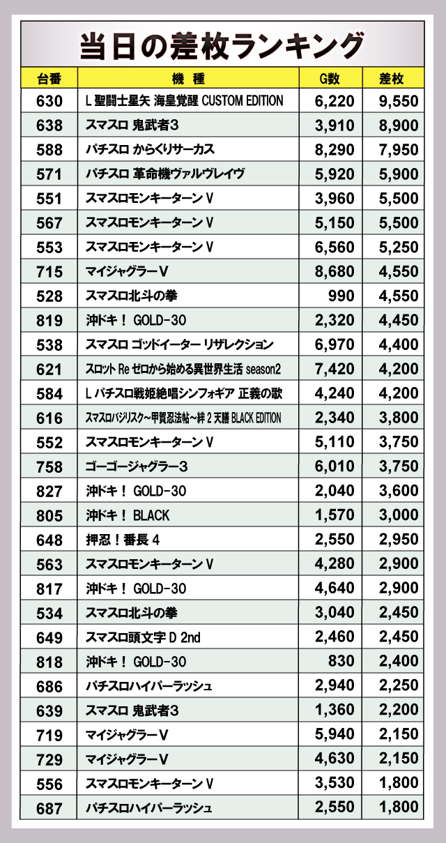 『L聖闘士星矢 海皇覚醒 CUSTOM EDITION』から+9,000枚OVERが発生しており、当日の店内の盛り上がりをリードしていた。これに『スマスロ 鬼武者3』が続いており、まとまった出玉を確保する台が多かったのも見逃せない。何よりも開店から閉店まで打ち込まれた形跡が見られ、館内には手応えを感じられる状況が整っていた事実が窺えるばかりだ。