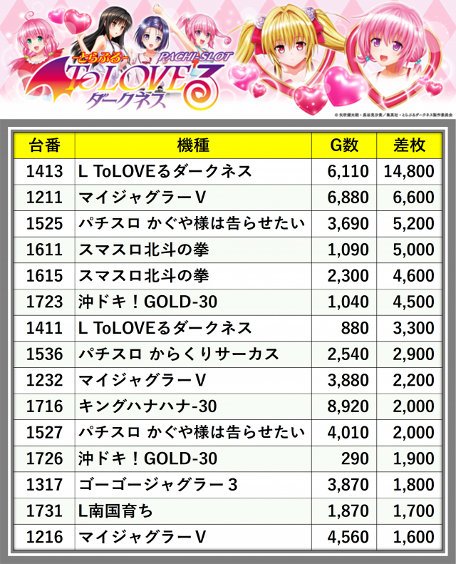 厳選された取材対象機種をはじめ、その他スロット全体から好記録が飛び出した!プレイヤーが楽しんだ1日を下記データにて振り返ってみて欲しい。