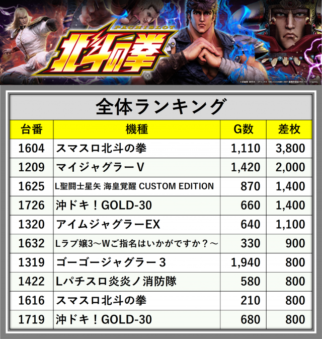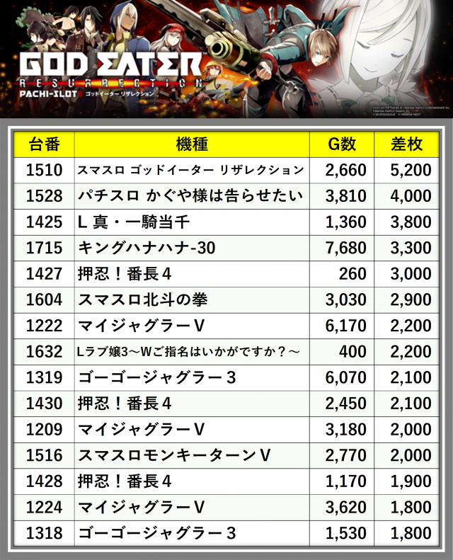 厳選された取材対象機種をはじめ、その他スロット全体から好記録が飛び出した!プレイヤーが楽しんだ1日を下記データにて振り返ってみて欲しい。