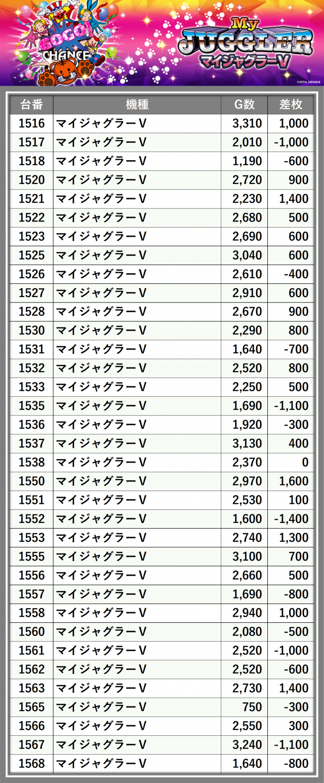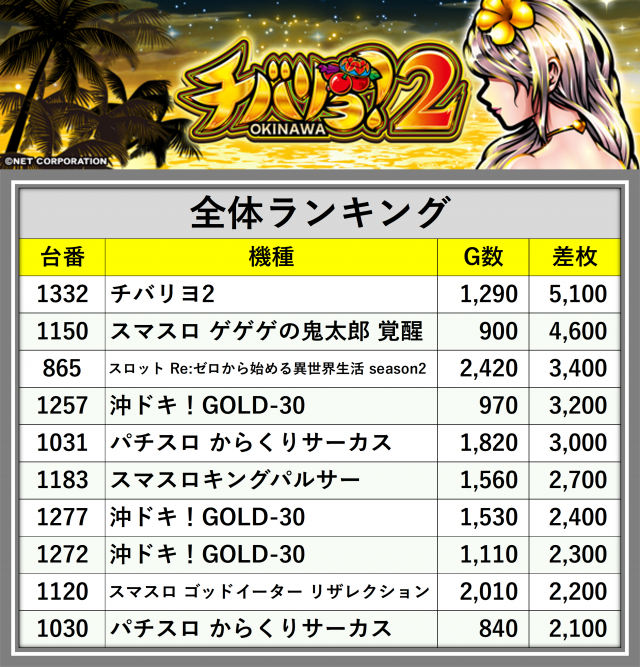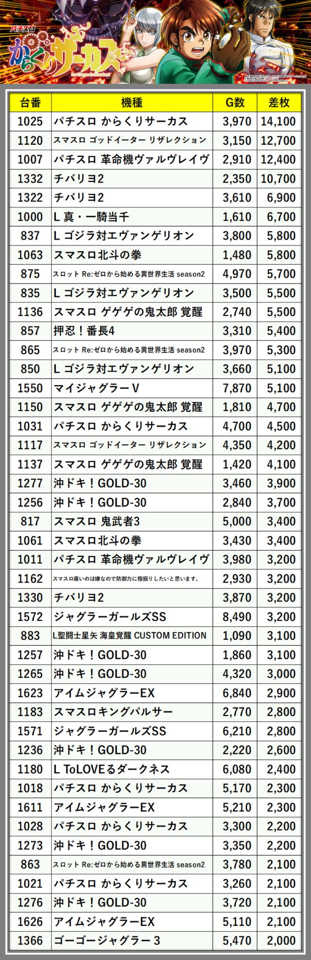 ※差枚数順に掲載しています