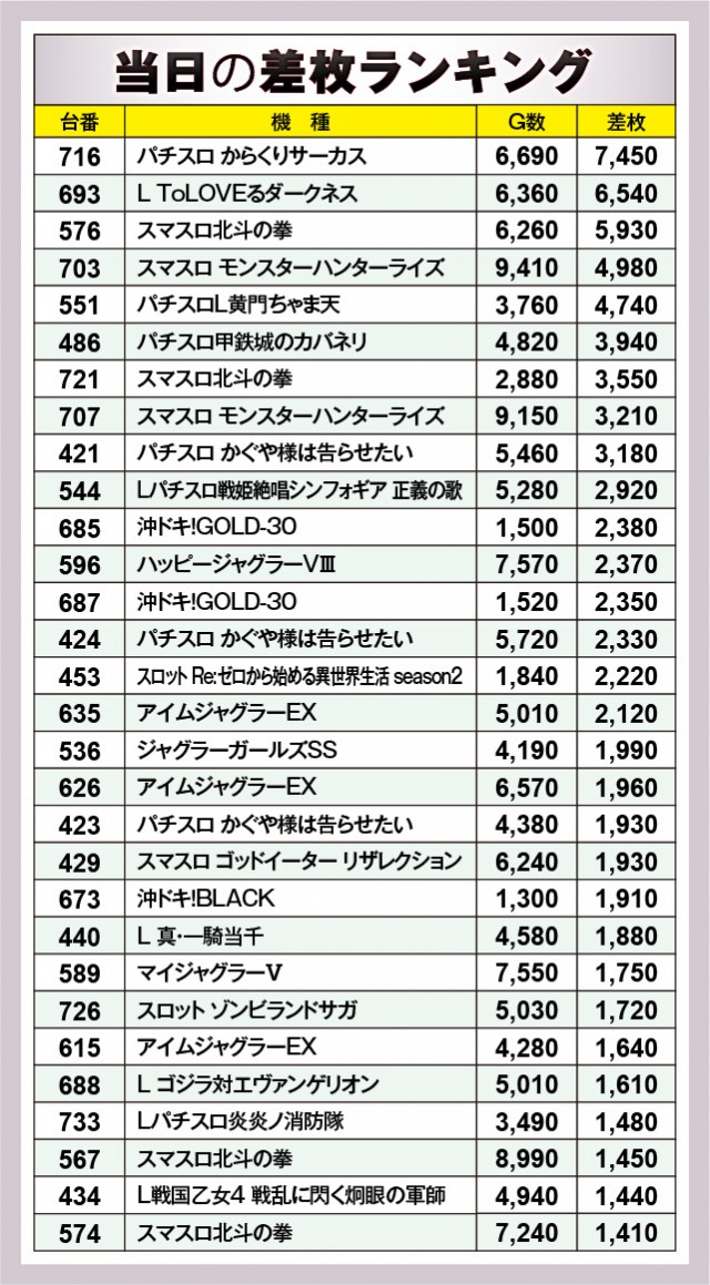 優秀機種をチェックすると、あまり大きなマイナスが見られないのが特徴的だ。大台突破台を果たした『スマスロ北斗の拳』や『L ToLOVEるダークネス』、『パチスロ からくりサーカス』を筆頭に、AT機は賑わう状況を作り上げていた。もちろん『ジャグラー』シリーズと『沖ドキ』シリーズも追随しており、盛り上がりは館内に設置された全機種によって生み出されたものだと言えるだろう。