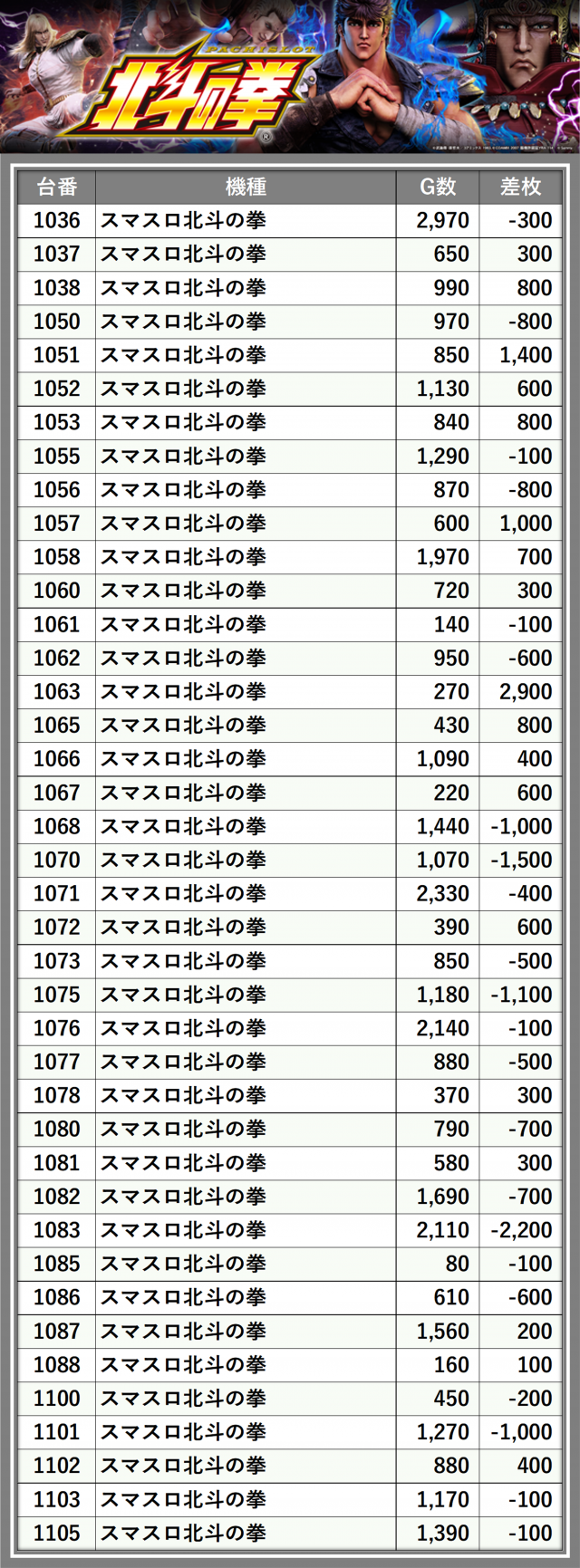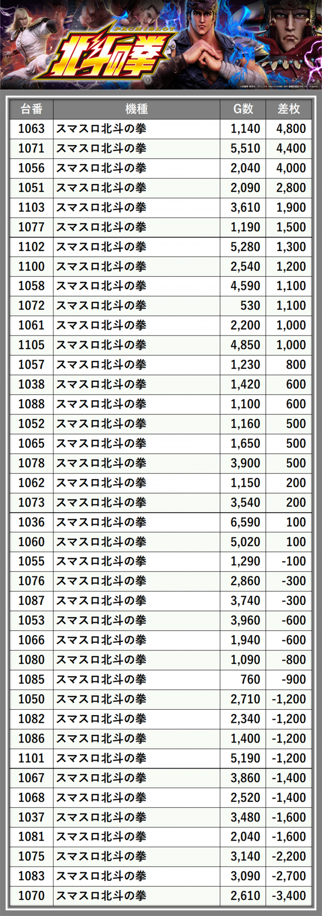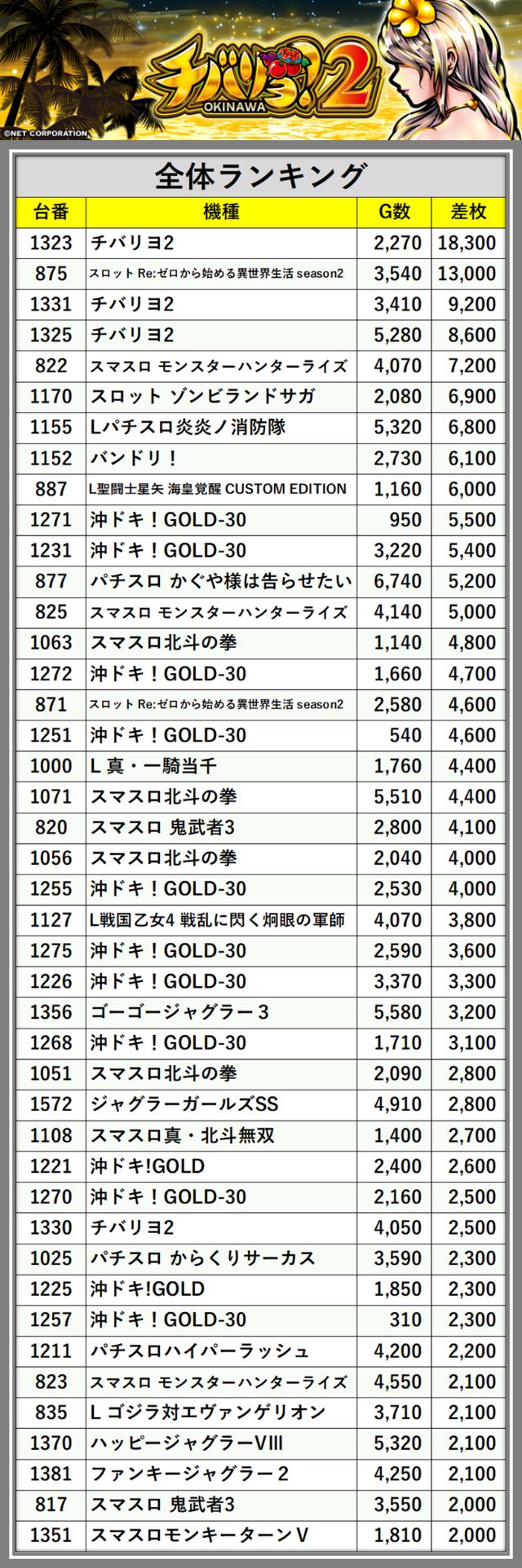 ※差枚数順に掲載しています