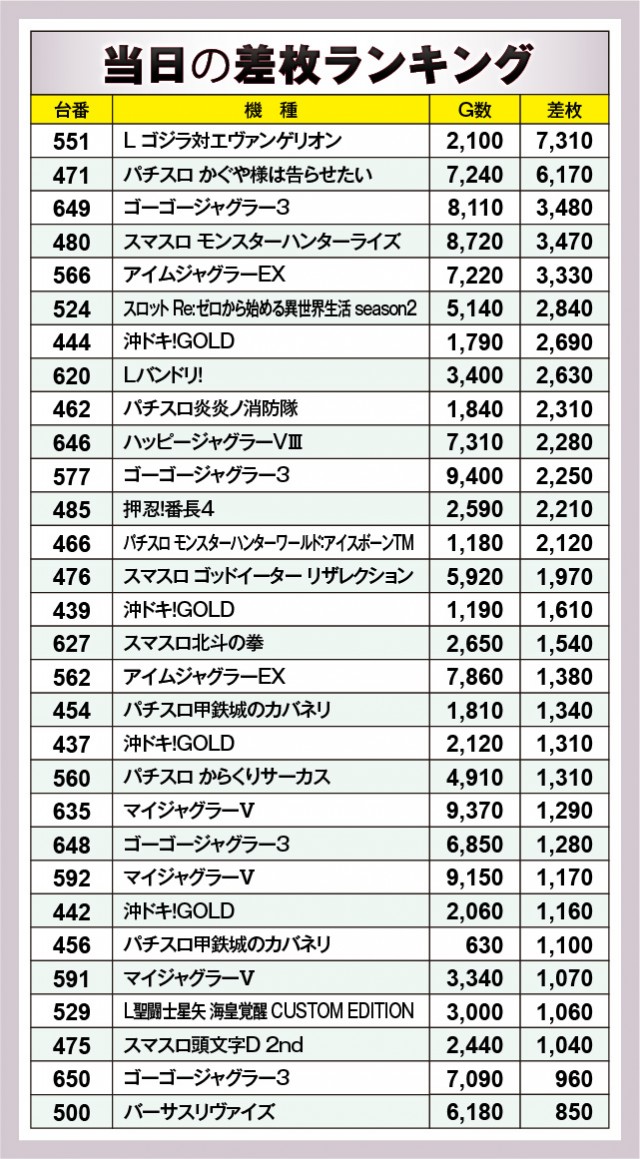 『パチスロ かぐや様は告らせたい』『L ゴジラ対エヴァンゲリオン』の活躍ぶりは前述した通りで、そこに『ゴーゴージャグラー3』も活気と熱気に満ちた展開を披露。回転数と差枚数が比例する展開が見られ、ファンはレバーオンに力が入っていたはずだ。『スマスロ ゴッドイーター リザレクション』もポテンシャルを秘めていたが、熱量の部分で遅れをとってしまい、次回以降の奮起に期待したいところだ。