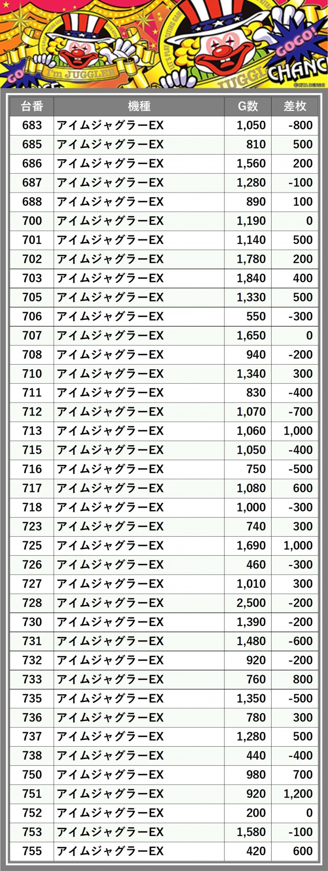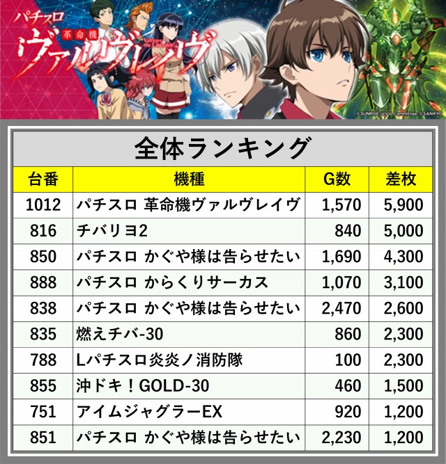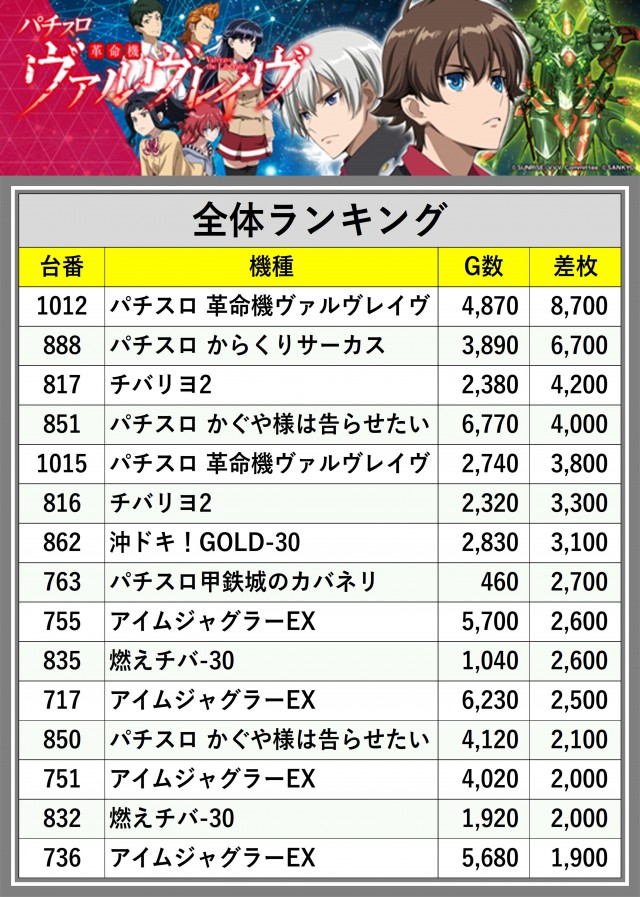 ※差枚数順に掲載しています