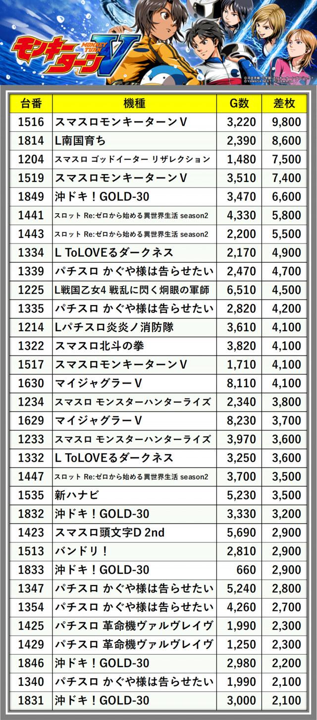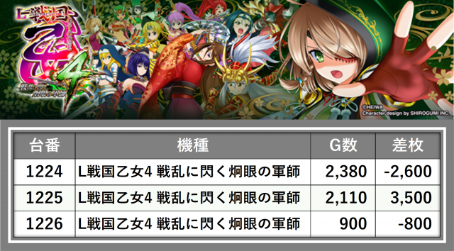 厳選された取材対象機種をはじめ、その他スロット全体から好記録が飛び出した!プレイヤーが楽しんだ1日を下記データにて振り返ってみて欲しい。