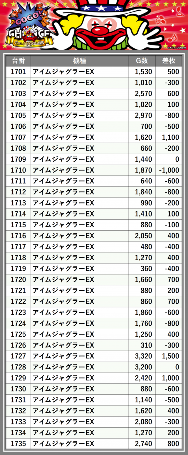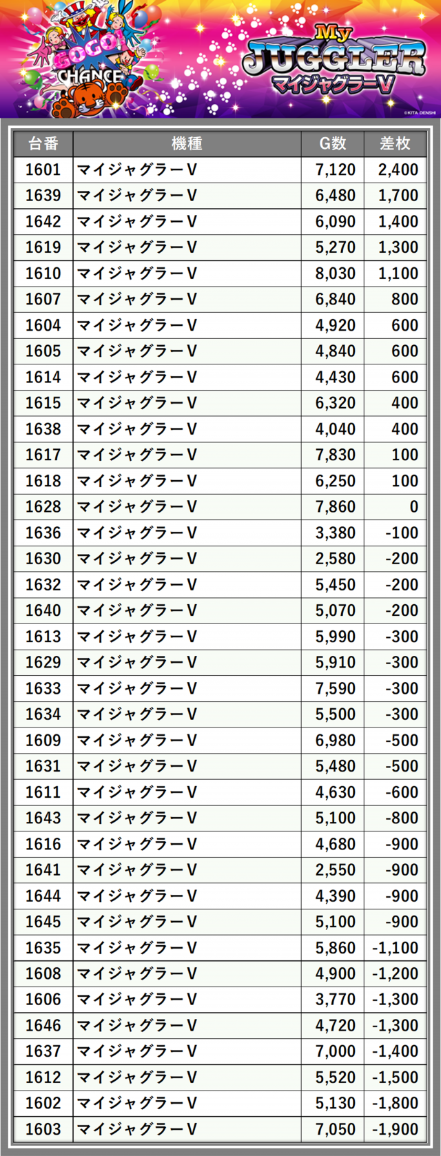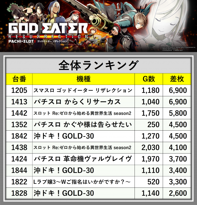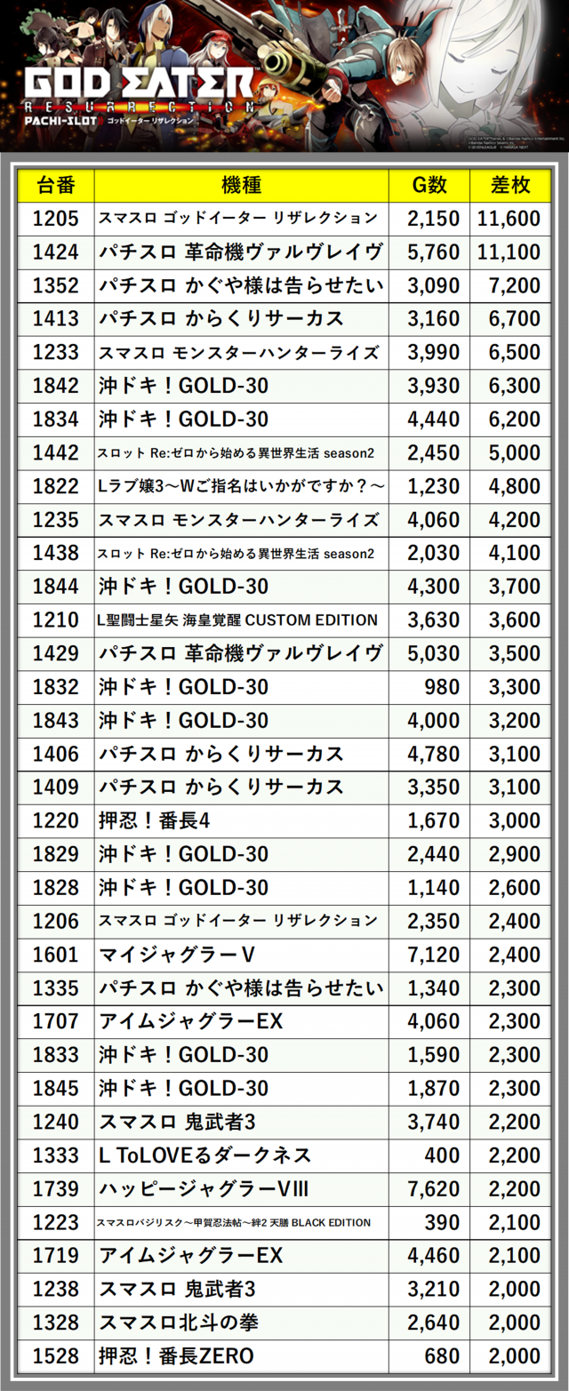厳選された取材対象機種をはじめ、その他スロット全体から好記録が飛び出した!プレイヤーが楽しんだ1日を下記データにて振り返ってみて欲しい。