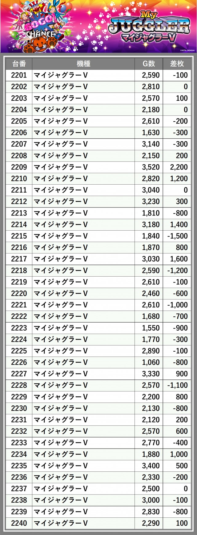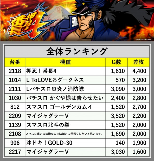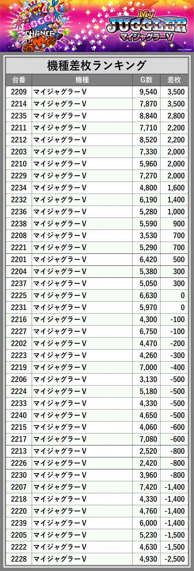 ※差枚数順に掲載しています
