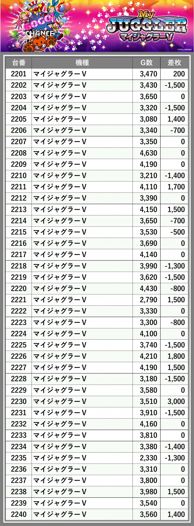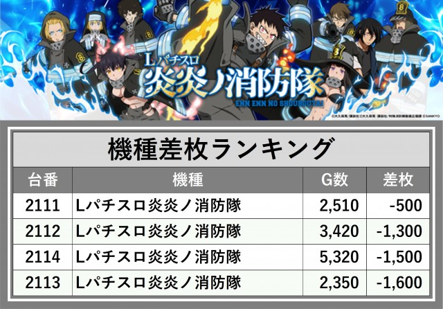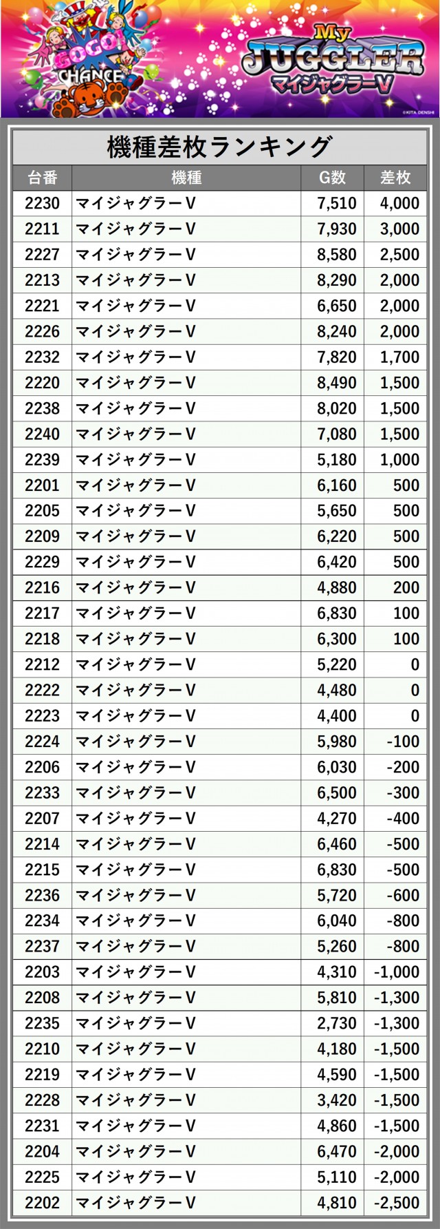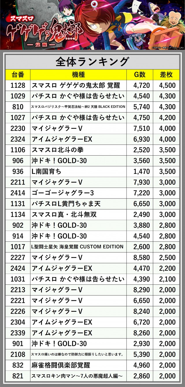 ※差枚数順に掲載しています