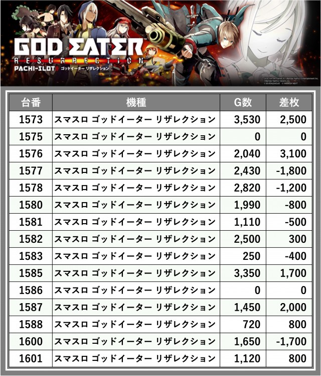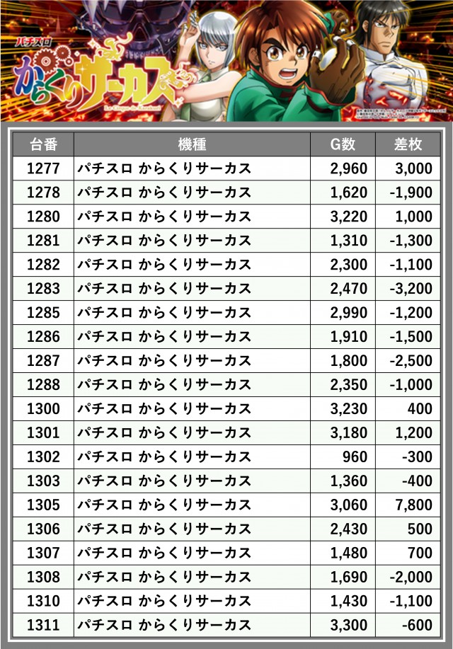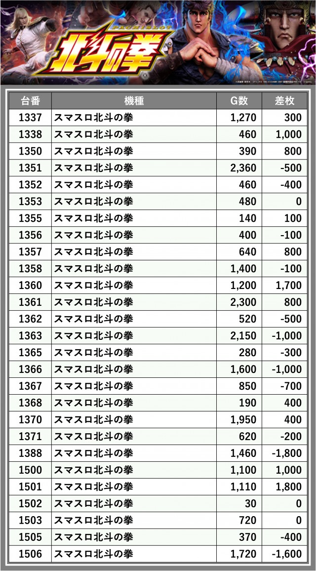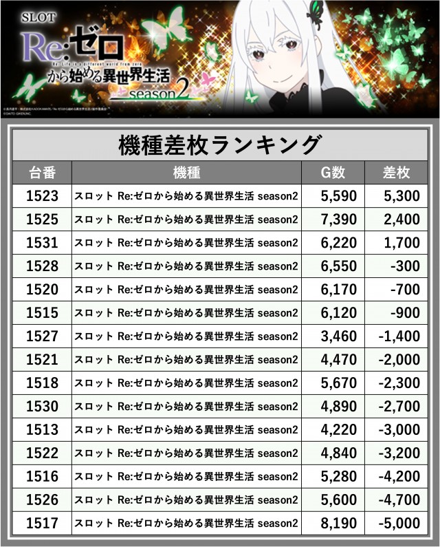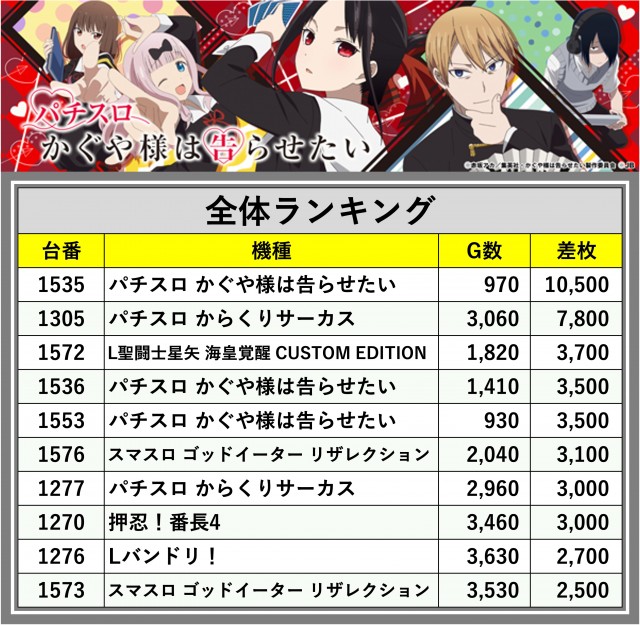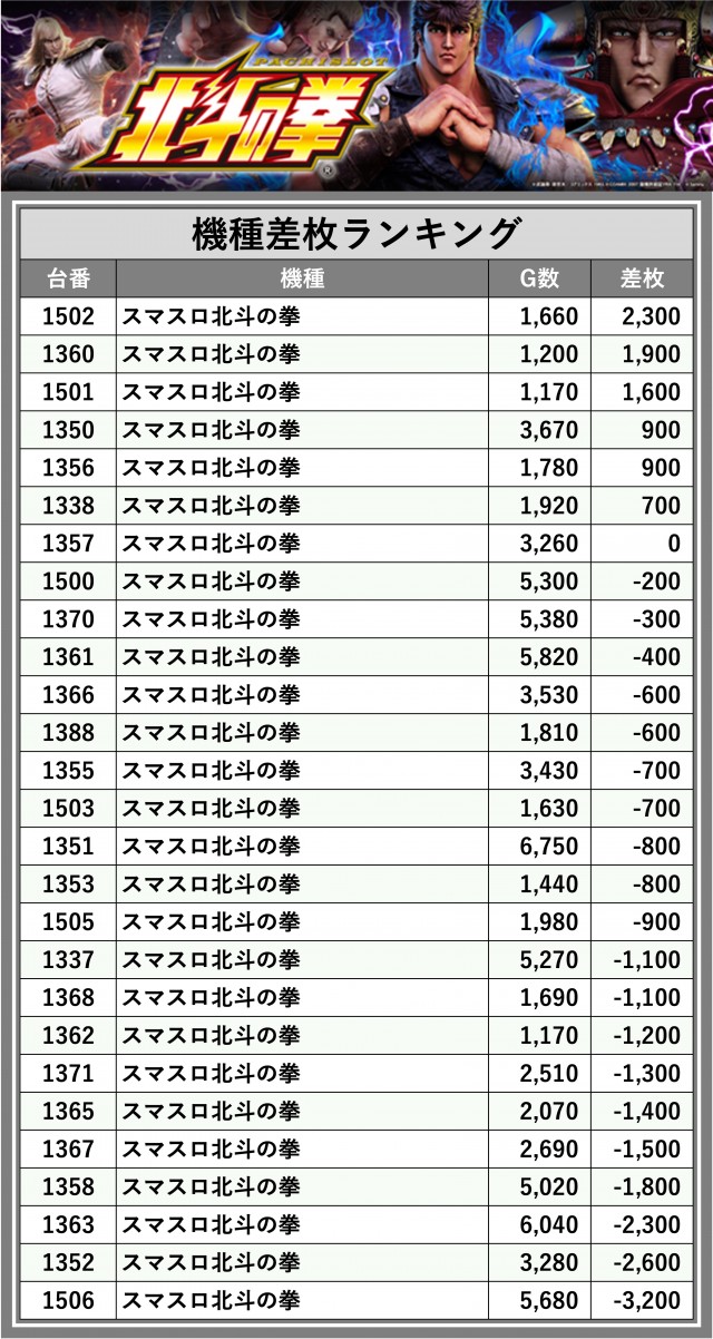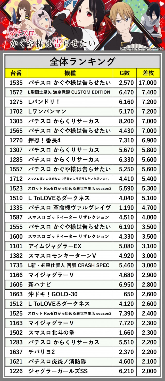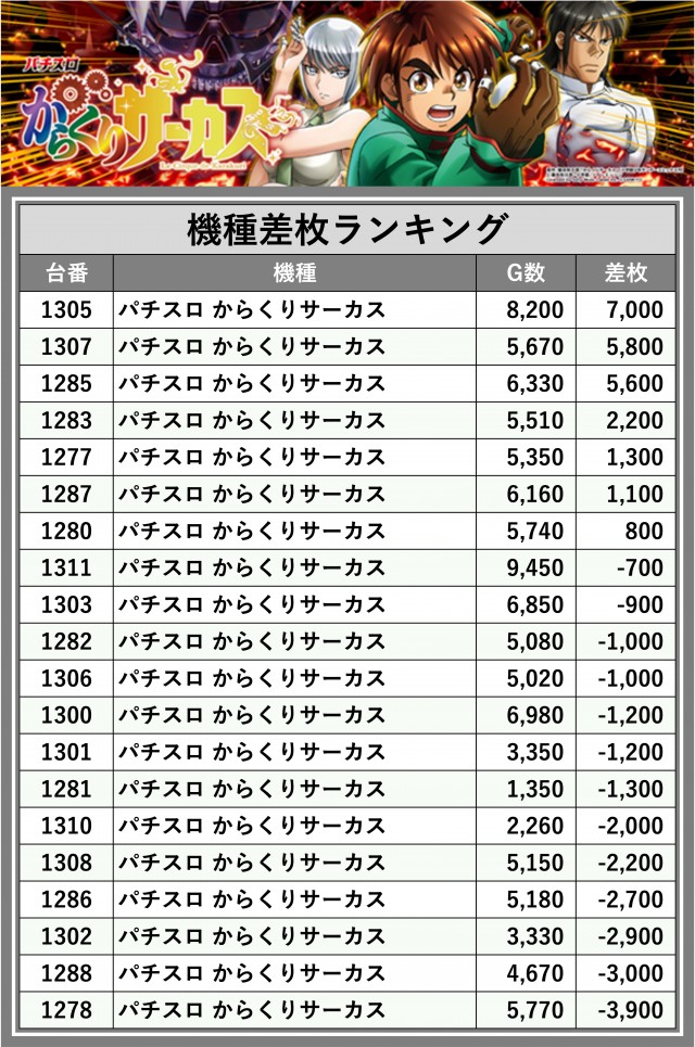 ※差枚数順に掲載しています