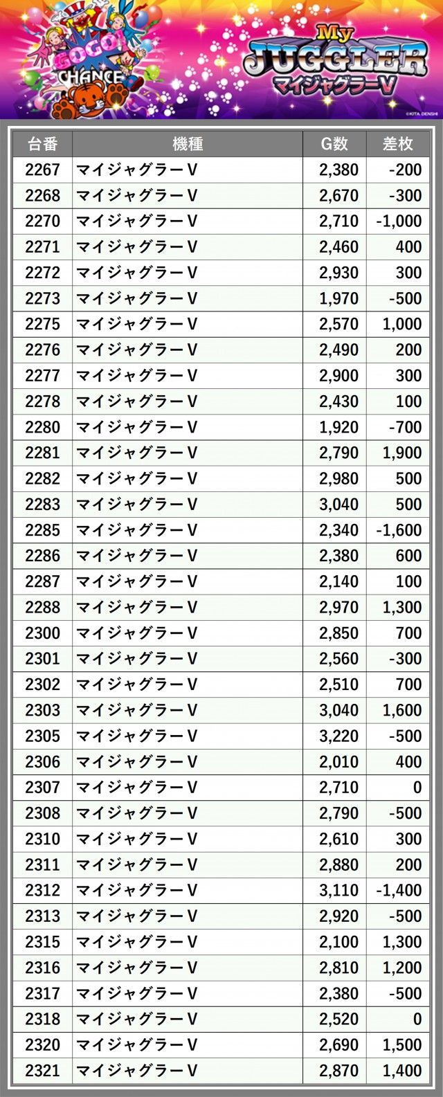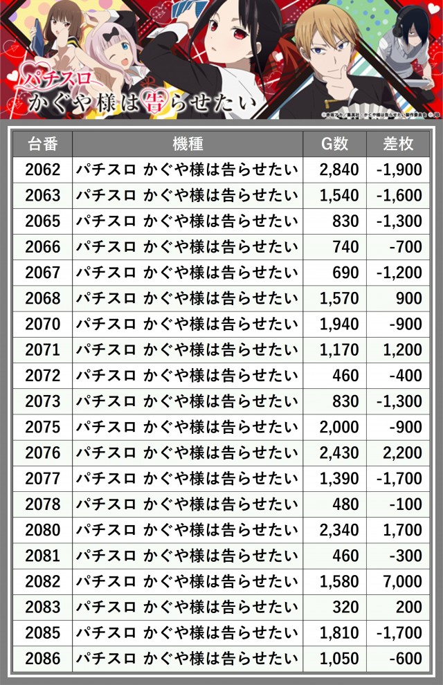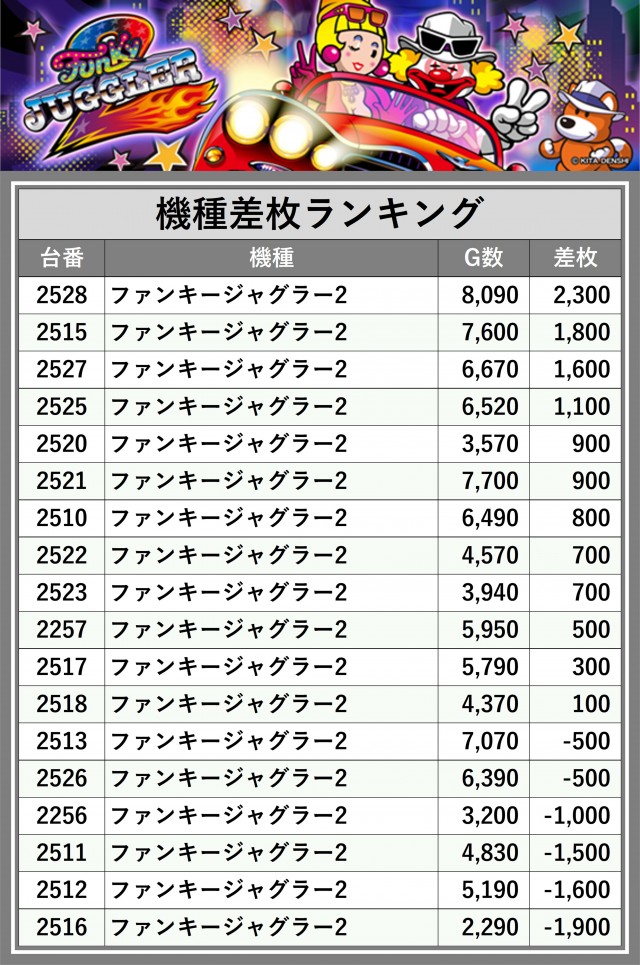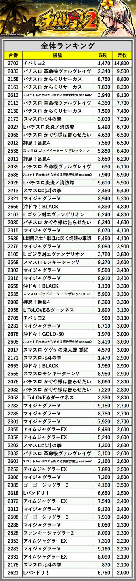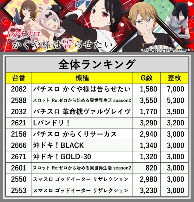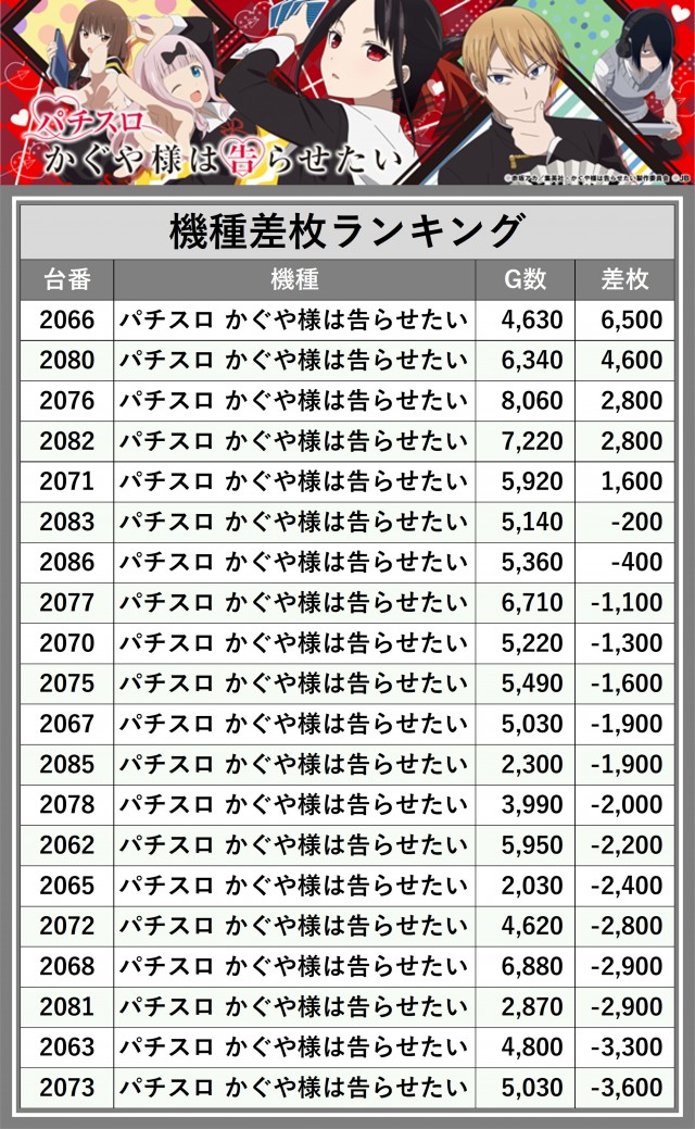 ※差枚数順に掲載しています
