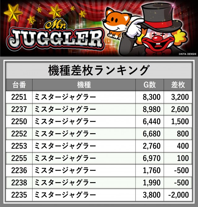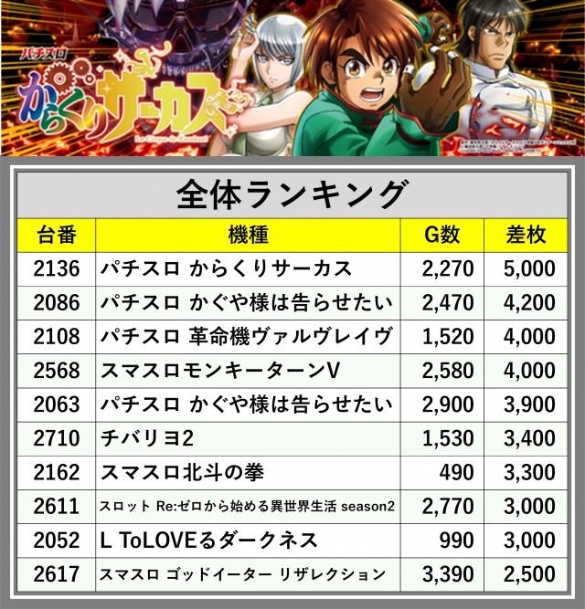 厳選された取材対象機種をはじめ、その他スロット全体から好記録が飛び出した!プレイヤーが楽しんだ1日を下記データにて振り返ってみて欲しい。