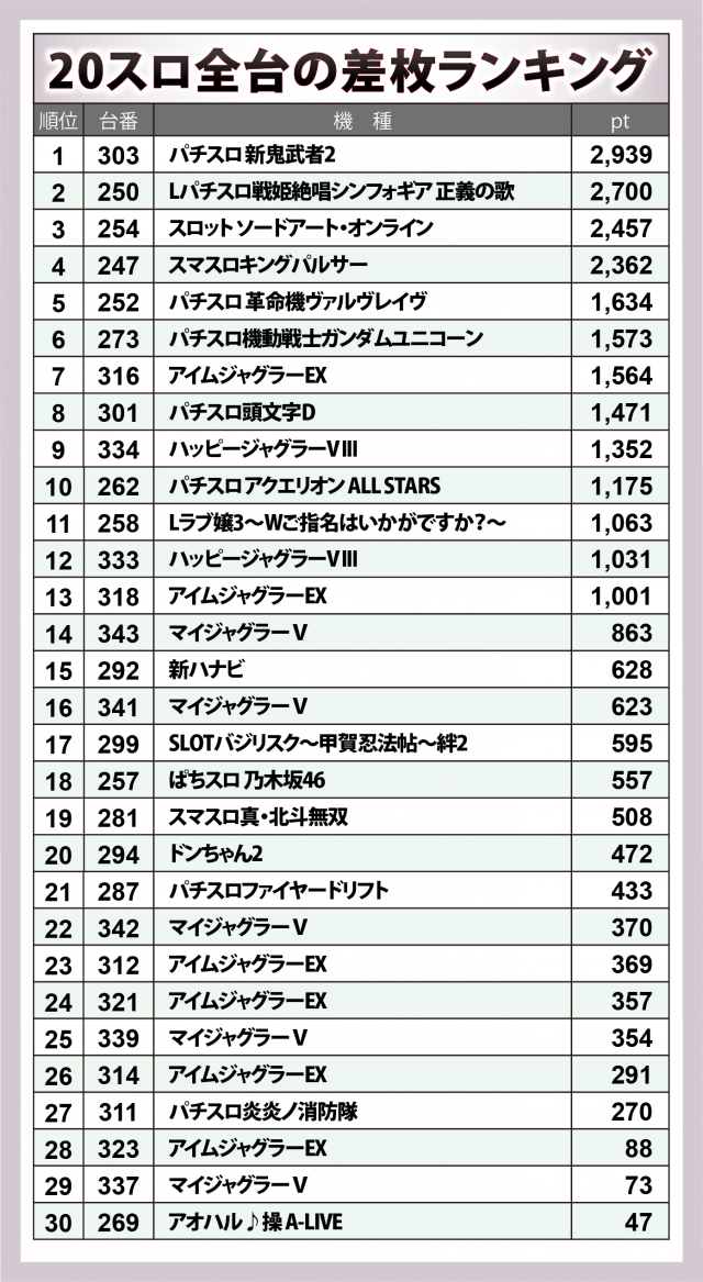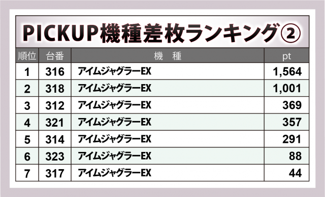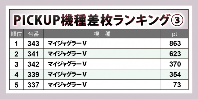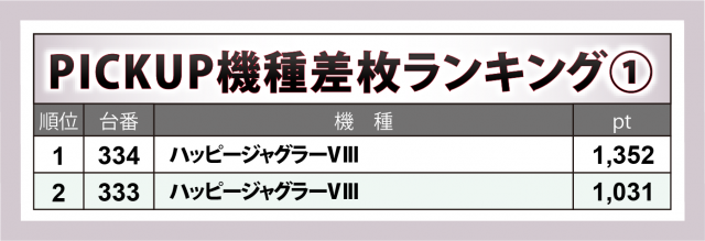 『ハッピージャグラーVⅢ』『アイムジャグラーEX』『マイジャグラーⅤ』と、差枚数はそれほど多くはなかったが、いずれも過半数を超える台がプラスを収めることができた。