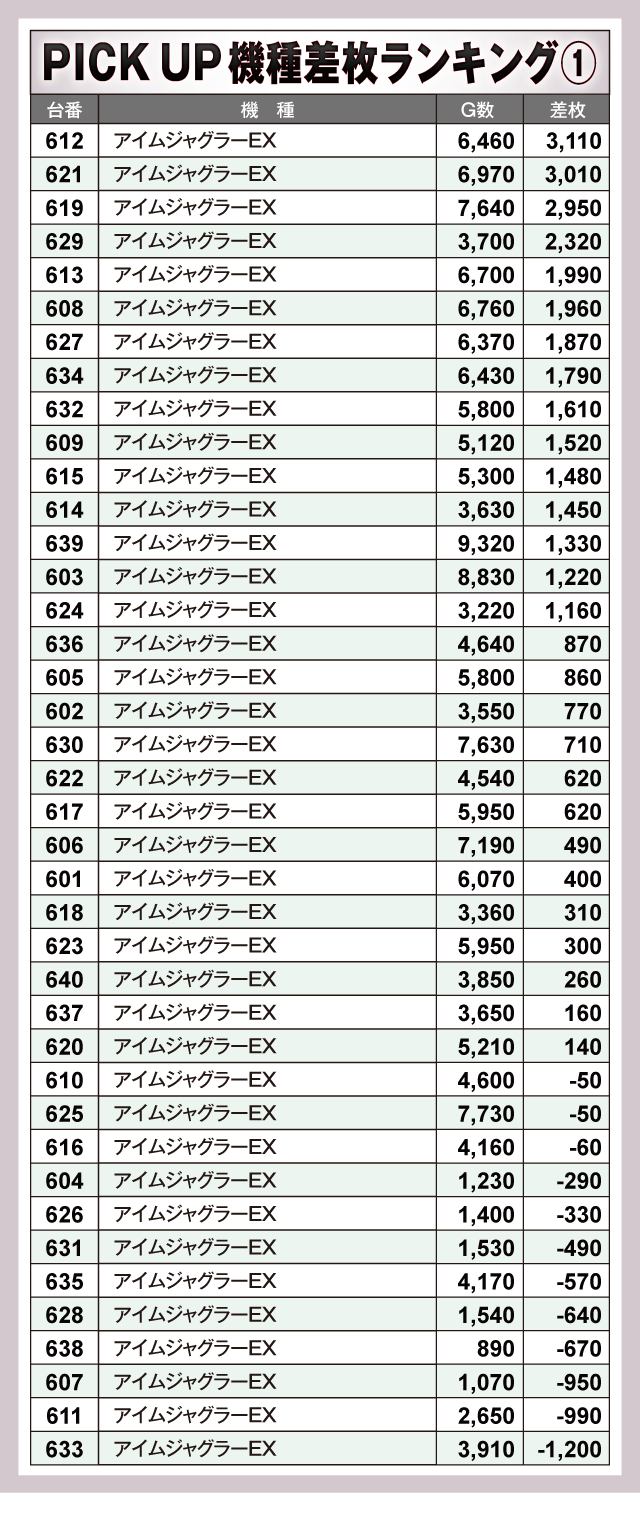 次にPICK UP機種を見てみると、お店の看板機種とも言える『アイムジャグラーEX』は全40台中28台がプラスで終了する盛況ぶりを見せていた。
