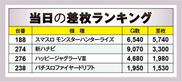 『新ハナビ』が9,000回転OVERを記録しており、終日を通して打ち込まれた結果、3,000枚OVERとまとまった出玉を確保。ノーマル機の真髄を思う存分楽しんでおり、ファンは有意義な時間を過ごせたことだろう。また『スマスロ モンスターハンターライズ』も5,000枚OVERを達成しており、熱量を伴った状況だったと言える。他にもポテンシャルを秘めた台が多かったはずで、同店の意気込みが感じられた。