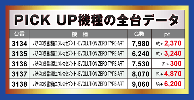 楽園上新屋店は『パチスロ交響詩篇エウレカセブン HI-EVOLUTION ZERO TYPE-ART』が全台プラスな上に6,000pt超も飛び出す盛り上がりを見せた。