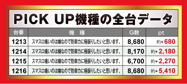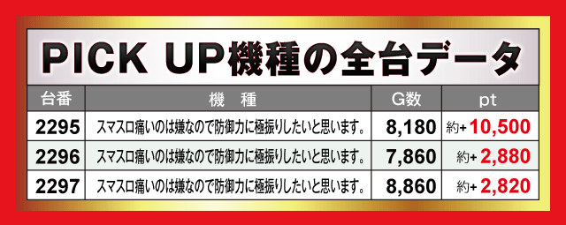 今回の全店共通PICK UP機種は『スマスロ痛いのは嫌なので防御力に極振りしたいと思います。』と『スマスロ頭文字D 2nd』の2機種。両機種合わせた全店舗の総台数は28台で、そのうちの22台がプラスで終了しているだけに、各店舗のシマでは常に活気とファンの笑顔で満ち溢れていた。