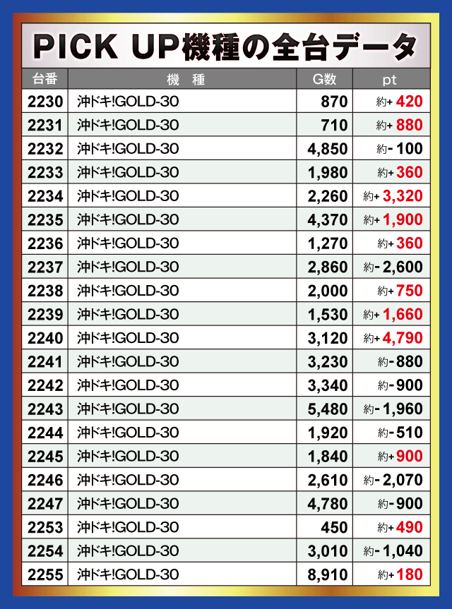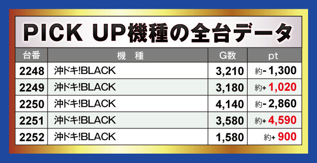 楽園沼津店がPICK UPしたのは『沖ドキ!BLACK』と『沖ドキ!GOLD-30』の2機種で、それぞれから4,000pt超が発生している。