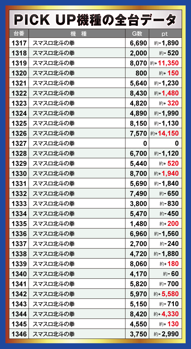 楽園袋井店は両機種合わせて計7台。なんと、その全てがプラスで終了するという見事なパフォーマンスを披露していた。
