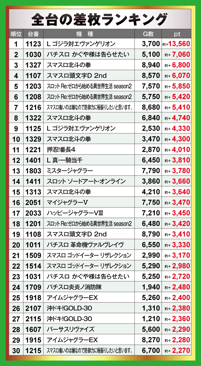 また、その他の機種をチェックしてみると、『パチスロ かぐや様は告らせたい』1030番台で7,000pt超、『スロット Re:ゼロから始める異世界生活 season2』で5,000pt超が複数など、比較的新しめの機種の活躍も目立っていたのが印象的であった。