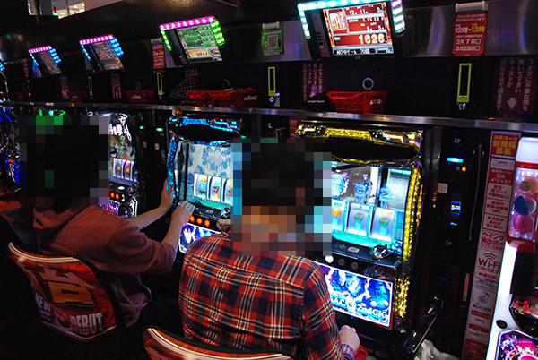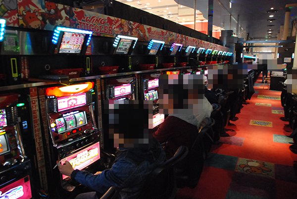 「マイジャグラーⅢ」や「ゴーゴージャグラー」を筆頭に、ジャグラーシリーズも大にぎわい。なかには、華麗なパフォーマンスを披露するプレイヤーがおり、シマ全体に明るいムードをつくりだしていた。