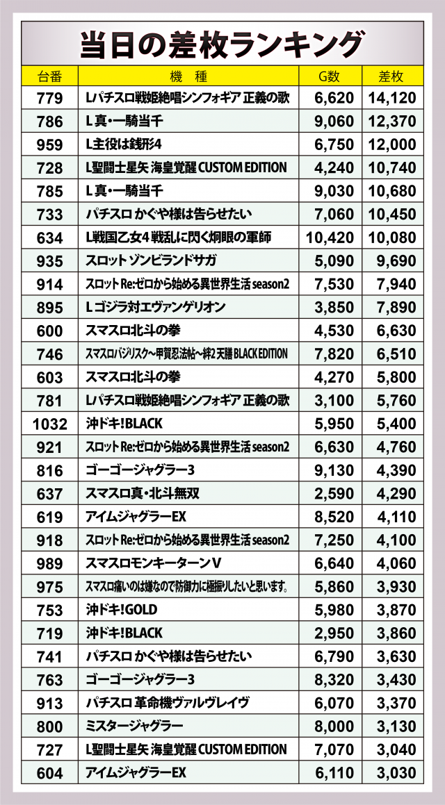 さらに『スロット ゾンビランドサガ』の+9,700枚弱、『スロット Re:ゼロから始める異世界生活 season2』では+7,900枚超・+4,800枚弱・+4,100枚超が1台ずつ、『L ゴジラ対エヴァンゲリオン』の+7,900枚弱、『スマスロ北斗の拳』では+6,600枚超・+5,800枚超が1台ずつ、『沖ドキ!BLACK』では+5,400枚超・+3,900枚弱が1台ずつと、他ホールでも人気の高い機種の名が並んだ。