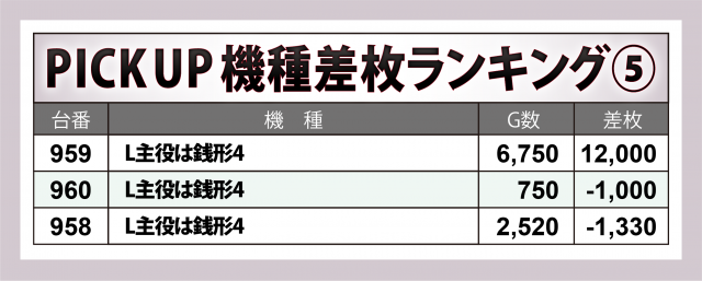 上位30台および注目5機種が残した数値はハイグレード、そして何と言ってもプラス5桁となった台数が同店当タイトルの取材におけるレコードに達し、最上の成果を導いた。