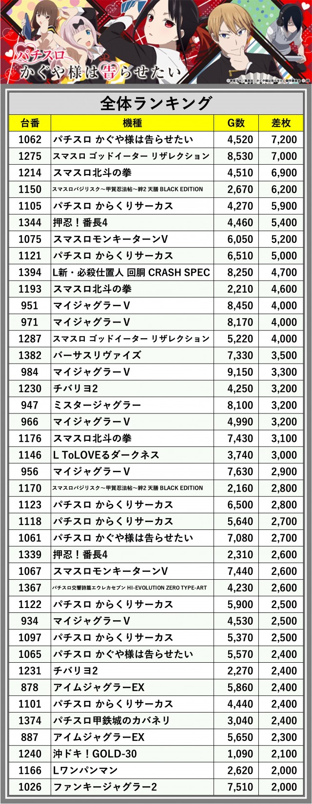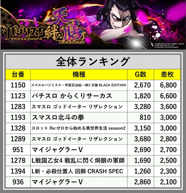 厳選された取材対象機種をはじめ、その他スロット全体から好記録が飛び出した!プレイヤーが楽しんだ1日を下記データにて振り返ってみて欲しい。