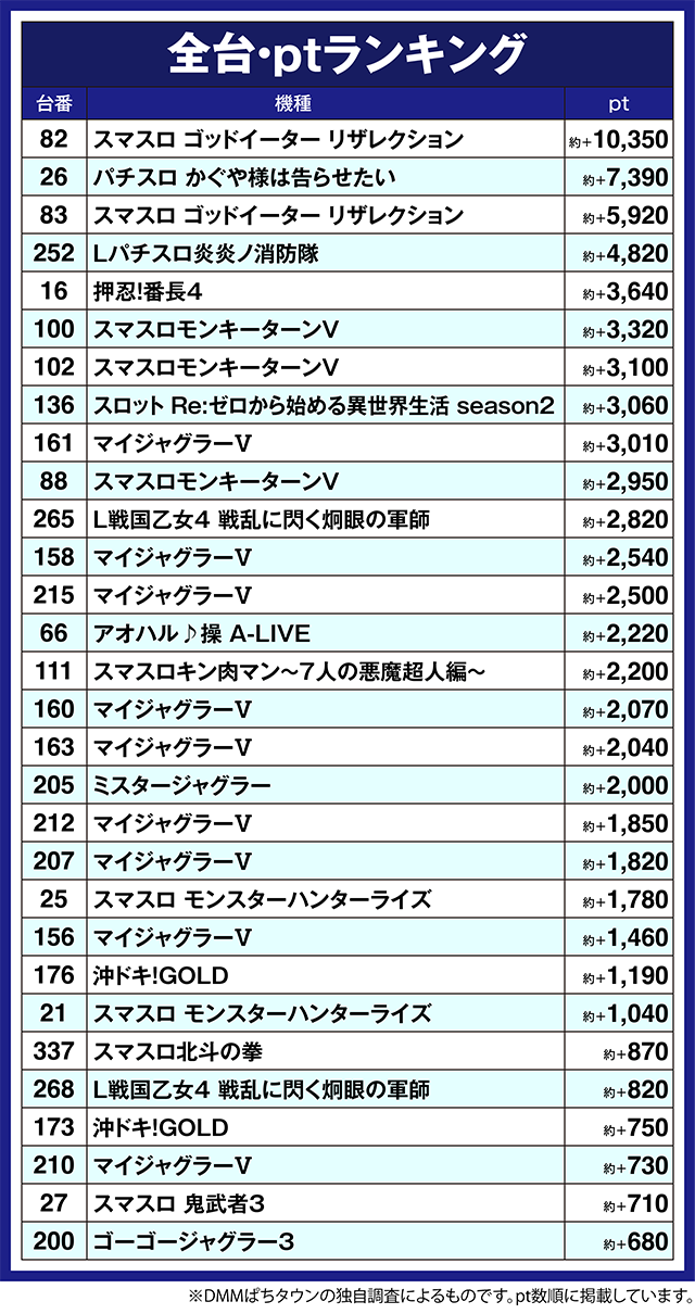 ほかにも、「Lパチスロ炎炎ノ消防隊」の252番台が約+4,820pt、「押忍!番長4」の16番台は約+3,640ptと、いくつもの台がプラスとなった。
