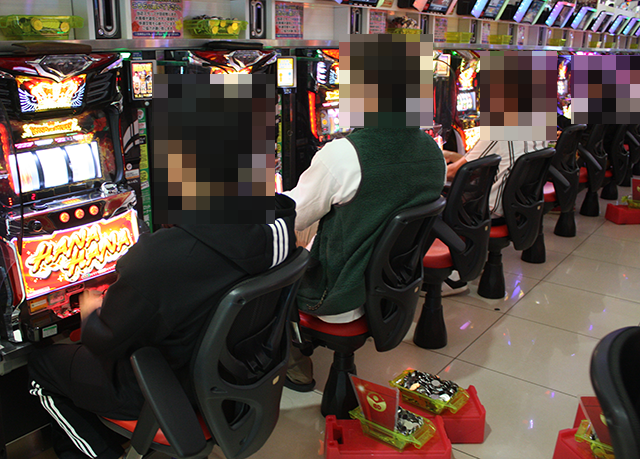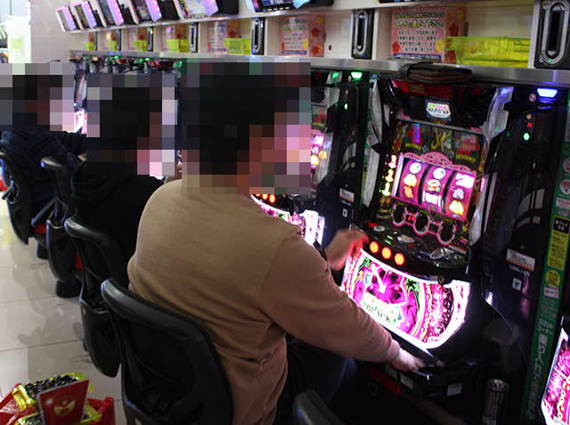 「マイジャグラーⅤ」と「ジャグラーガールズSS」に、1箱以上の持ち玉を使い、うれしそうに遊技をおこなう姿があった。
