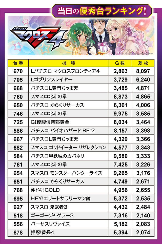 意外な機種が最高差枚レコードとなった今回。それもそのはず、『Lパチスロ マクロスフロンティア4』はバラエティー島の2台設置機種であり、まさか首位の座に降臨するなど誰も予想してなったはず。