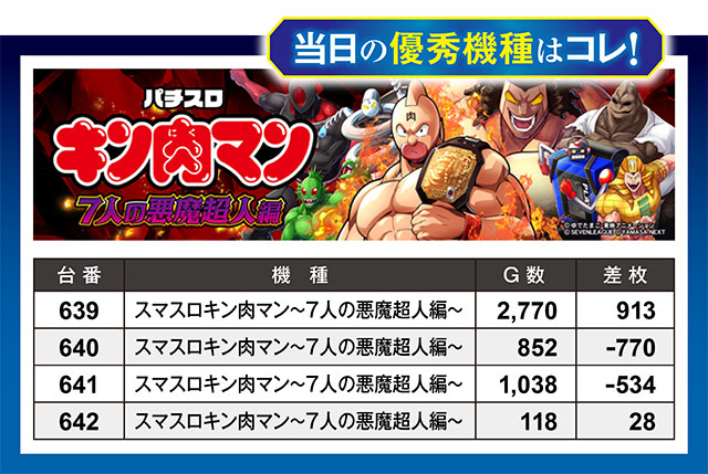 『スマスロキン肉マン~7人の悪魔超人編~』4台の結果は2台プラス&2台マイナス。総ゲーム数が少なすぎて、この結果もやむなしといったところ。