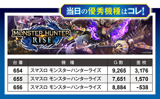 まだまだ新台色の強い『スマスロ モンスターハンターライズ』は注目度も高く、2/3台がプラスと大健闘!ド派手なプラス差枚とはいかなかったものの、まずまずの安定感!