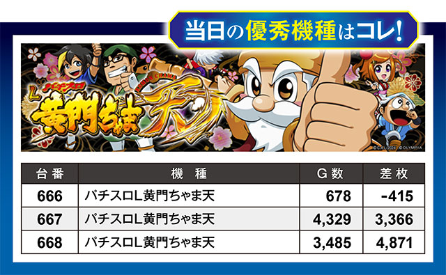 『パチスロL黄門ちゃま天』も2/3台がプラスに!しかもプラスの2台は揃って3,000枚オーバーというなかなかの結果。マイナスの666番台は700G未満しか回されておらず、もしがっつり回されていたら全台プラスも狙えていたかもしれない。