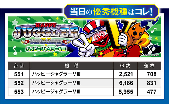 『ハッピージャグラーⅤⅢ』が全台プラスを達成!プラス数値は高くないが、まずはプラスで終わることが大事。そういう意味では及第点を与えてもいいだろう。