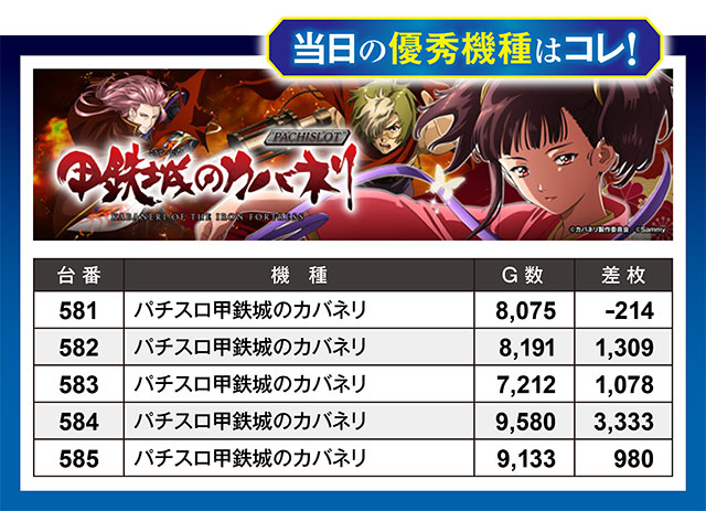 5台中4台がプラスだった『パチスロ甲鉄城のカバネリ』。機種まるごと好環境と思えるほどの結果であり、それを疑っていた常連さんもいたようだ。それだけに3,000枚超えが1台だけだったのが悔やまれる…。