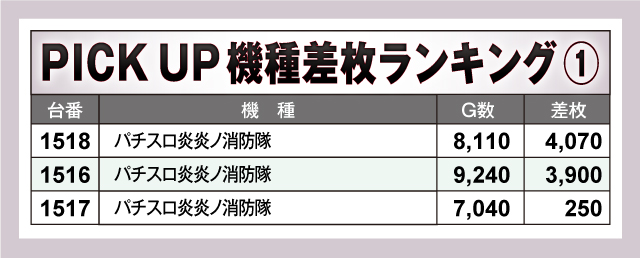 続いては、当日店内を大いに盛り上げた機種たちをチェックしていこう。今回ピックアップしたのは5機種で、各機種ごとに良台が多数出現。とくに「パチスロ炎炎ノ消防隊」の3台並びは、3台全台がプラス終了で、そのうち2台が+3,000枚オーバーと圧巻の成績! もちろんその他4機種からも好記録が多数出現していたぞ!