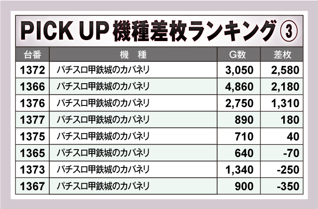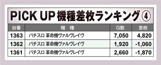 まずは当日の差枚ランキングを紹介していこう。12台うち8台が差枚+2,000枚オーバーで、+3,000枚オーバーは5台出現。それらのなかでもっとも優秀だった台は、1363番台の「パチスロ 革命機ヴァルヴレイヴ」で、差枚は+4,820枚を獲得! その他ランクイン機種を見渡すと、人気の「パチスロ炎炎ノ消防隊」や「ハナハナホウオウ~天翔~」など、特定の機種にチャンスが固まっていたようだ!