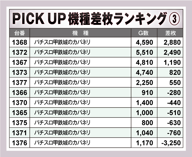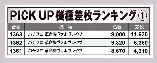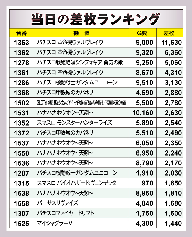 まずは当日の差枚ランキングを紹介していこう。19台のうち14台が差枚+2,000枚オーバーで、+3,000枚オーバーは5台出現。それらのなかでもっとも優秀だった台は、1363番台の「パチスロ 革命機ヴァルヴレイヴ」で、差枚は+11,630枚を獲得! その他ランクイン機種を見渡すと、さまざまな機種がランクインするなか、最優秀台を獲得した「パチスロ 革命機ヴァルヴレイヴ」や「ハナハナホウオウ~天翔~」など、特定の機種が複数ランクイン。人気機種を筆頭に楽しめる環境が整っていたようだ!
